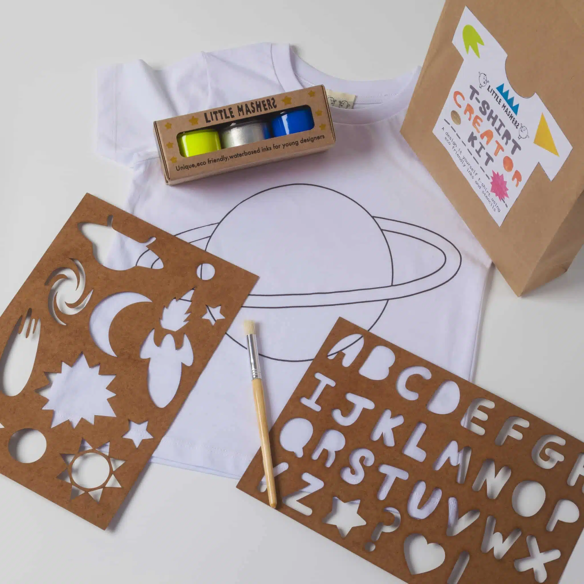 The Space Creative Kit is the perfect gift for young artists and designers. This t-shirt painting kit includes everything needed to create a unique and personalised t-shirt design, including eco-friendly fabric paints, a high-quality cotton t-shirt, a brush and space-themed stencils.